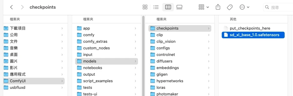 - 複製ComfyUI儲存庫到macOS的家目錄(可在Finder → 個人專屬找到)