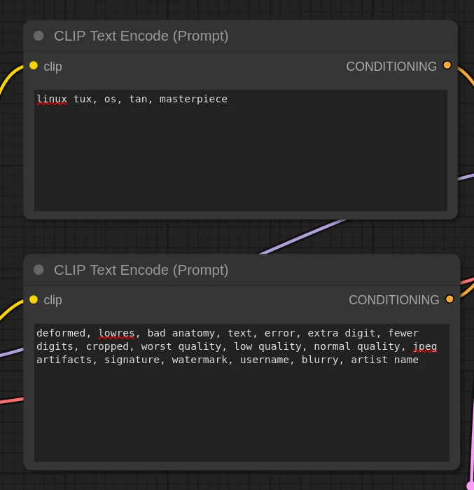再看連結著CLIP節點的CLIP Text Encode,即是提示詞(prompts)的欄位,在這二個框框填入正向與負向提示詞