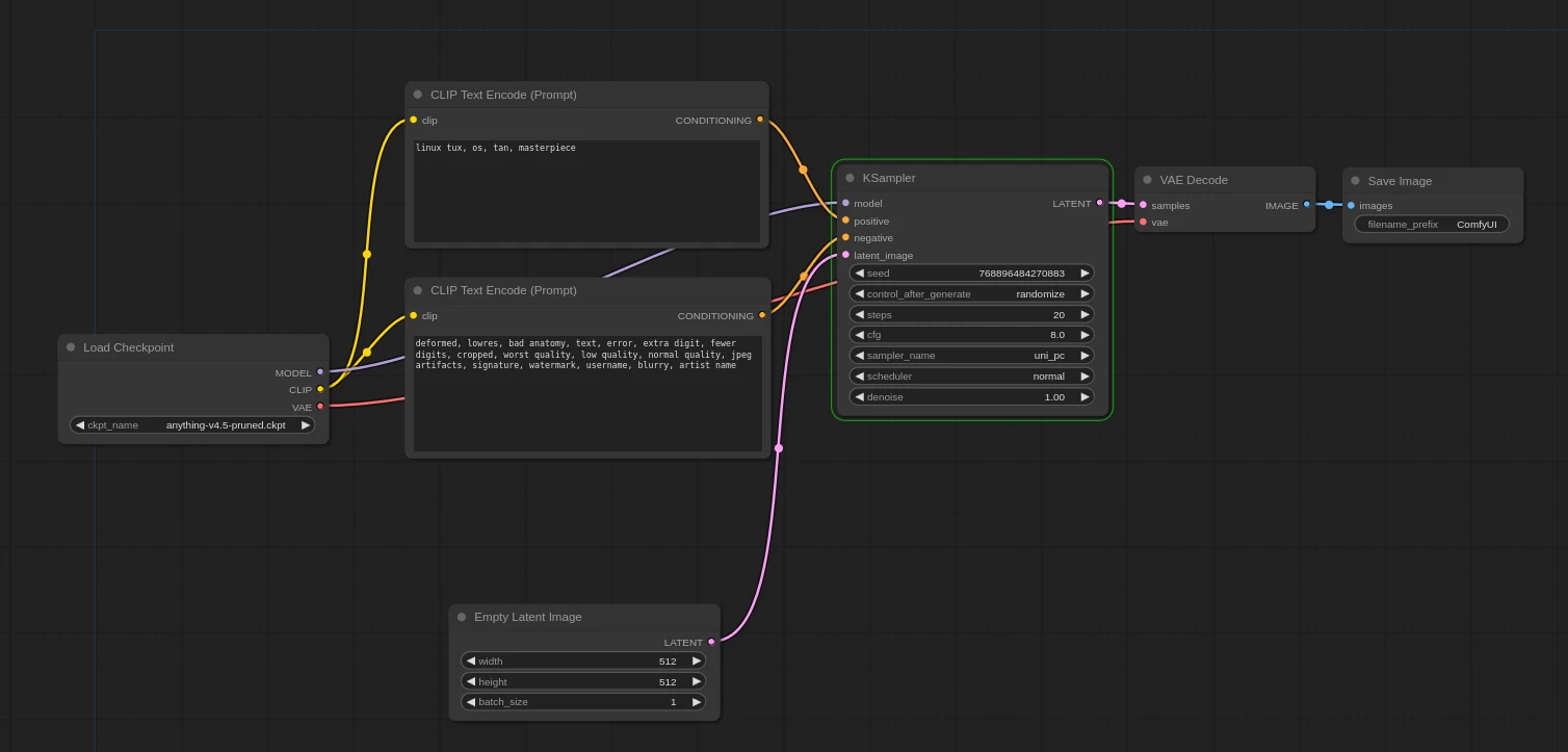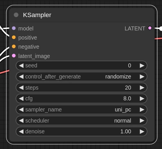 再往右邊,KSampler就是你要使用的取樣器了,步數(step)我們使用20,採樣器(sampler)維持預設的euler。