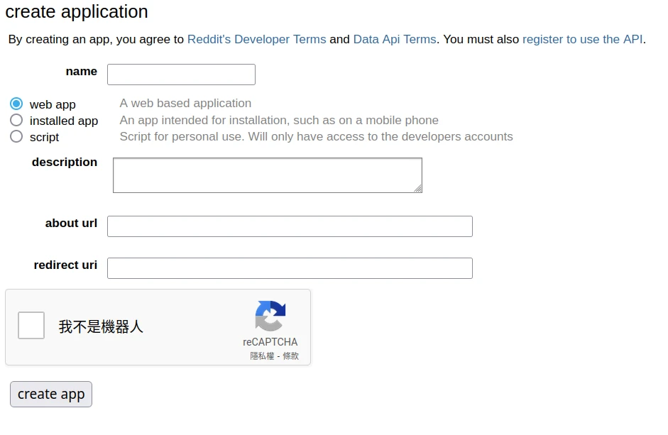依照指示,到Reddit個人帳號後台,點選create another app…