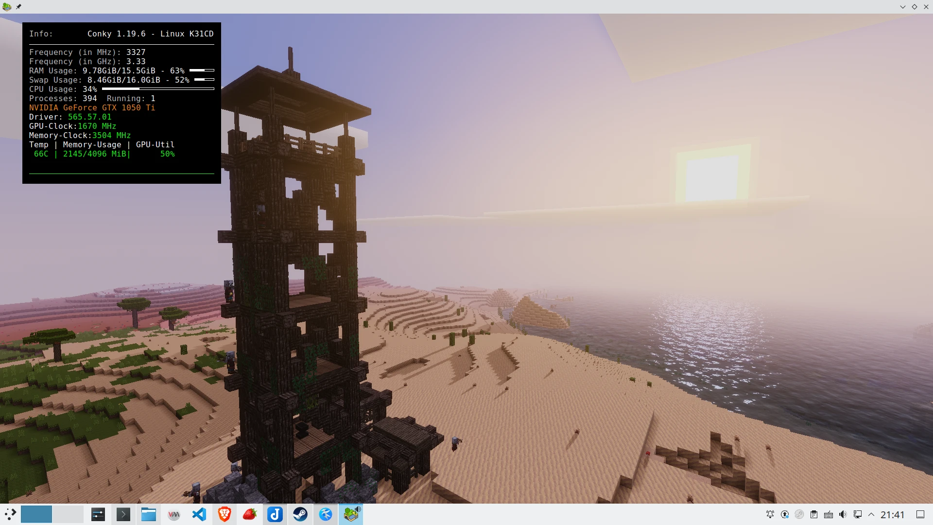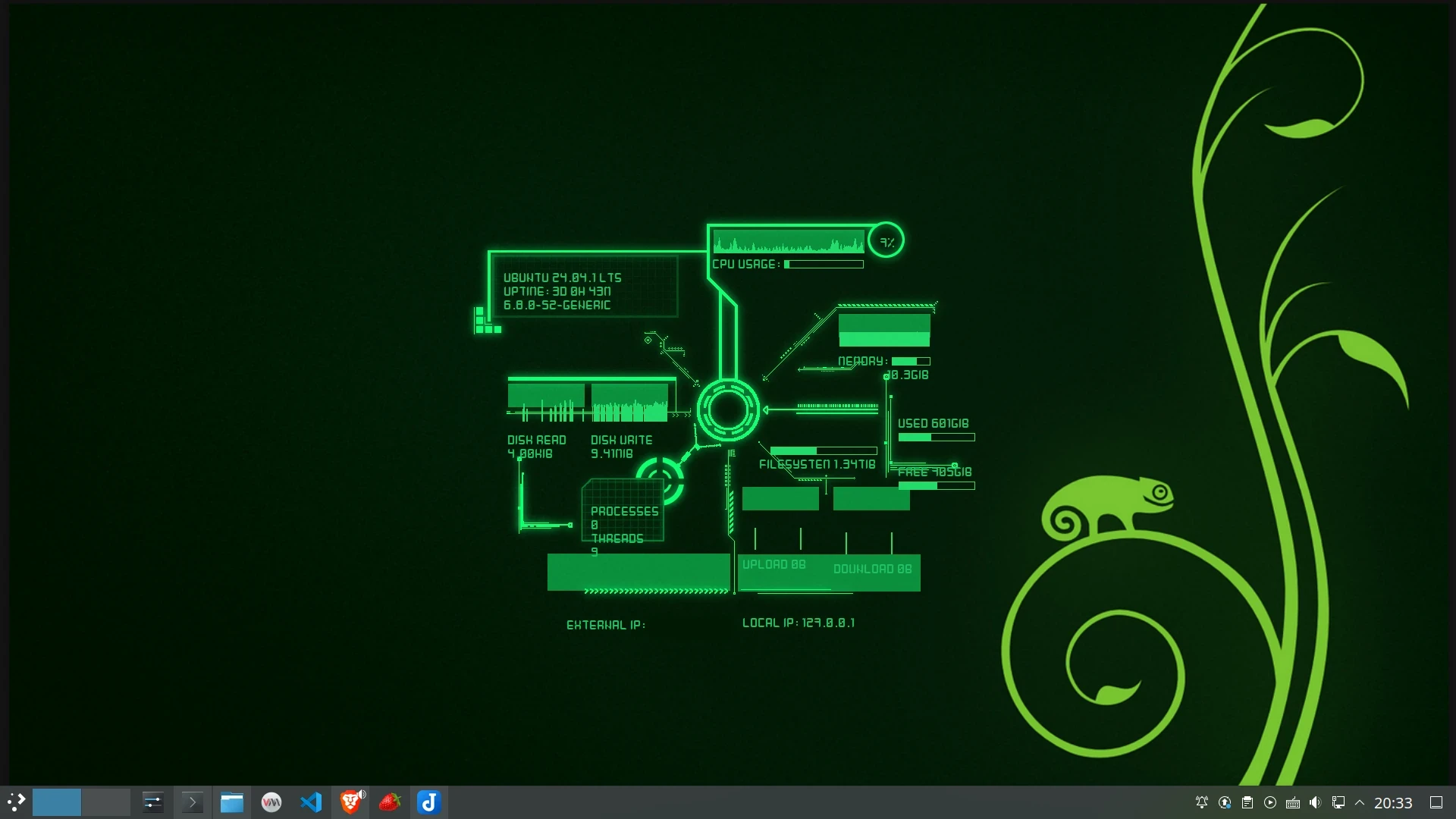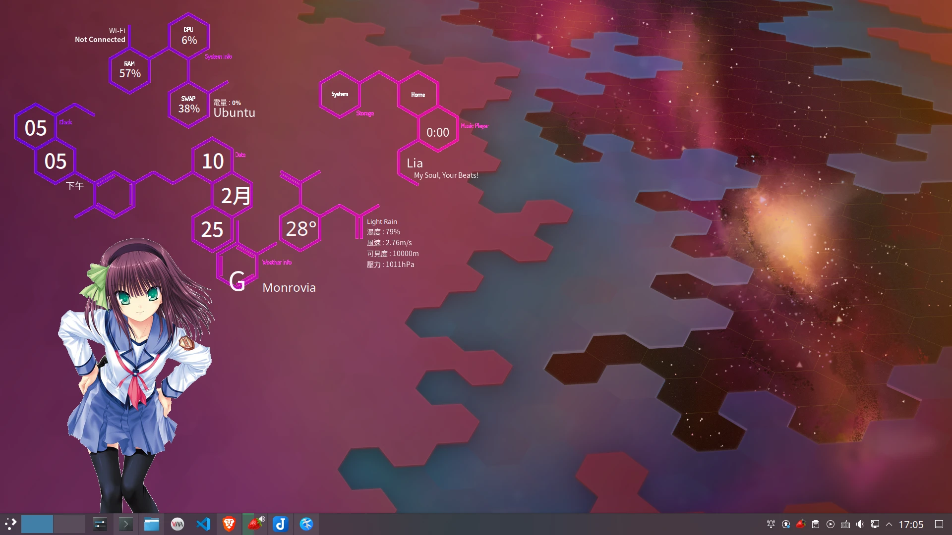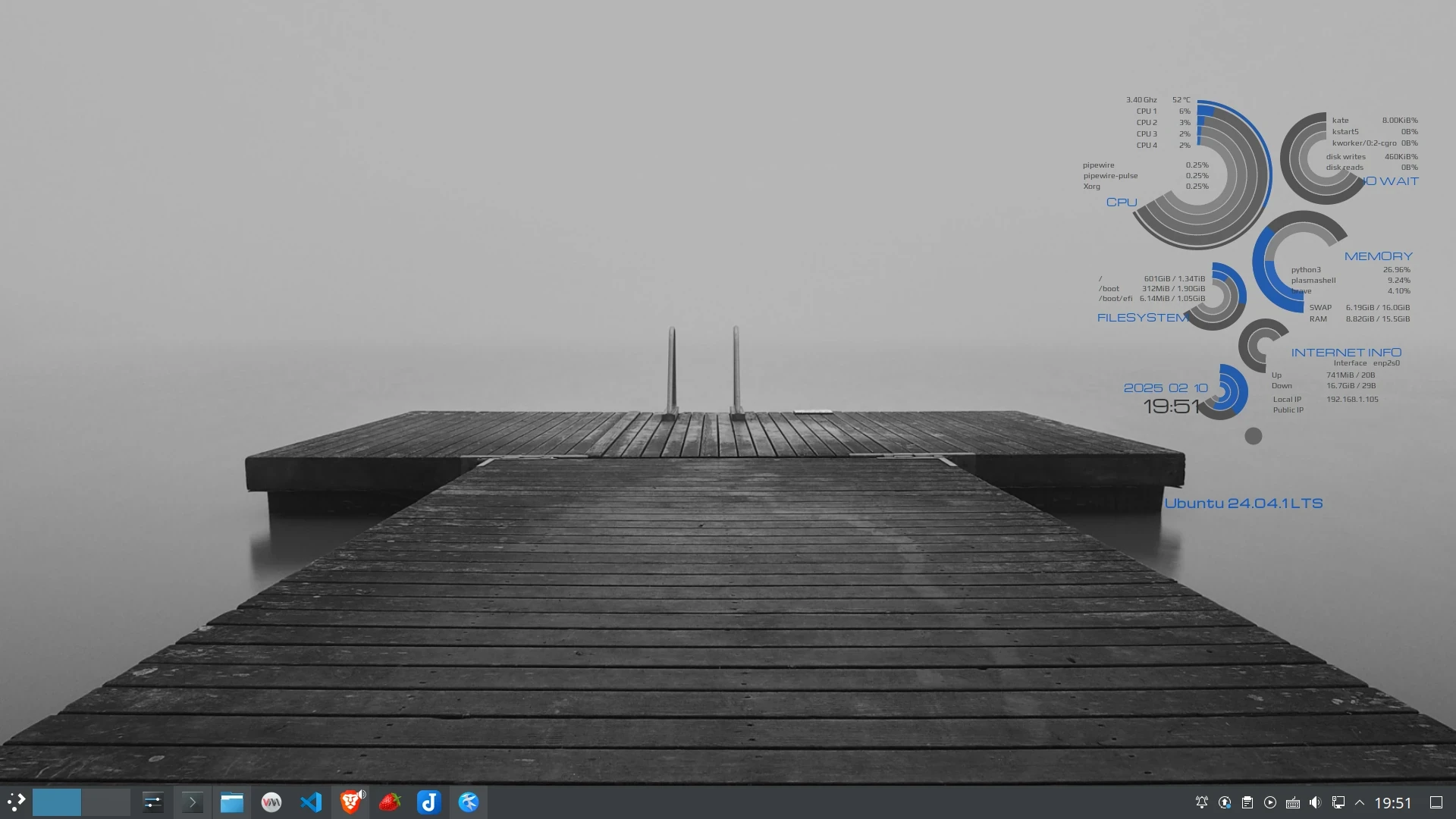 Conky,這是一款Linux系統的效能監控軟體,支援顯示CPU、GPU、溫度、RAM使用量、播放中的音樂、天氣等等資訊。