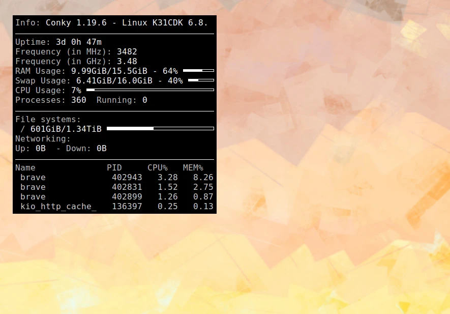 Conky並非htop那樣的終端機程式,執行後會一直待在你的Linux桌面持續顯示監控資料,切換到其他視窗就會被蓋住。不過可以將Conky調整為「顯示在所有視窗上方」,當作全域的資源監視器使用。