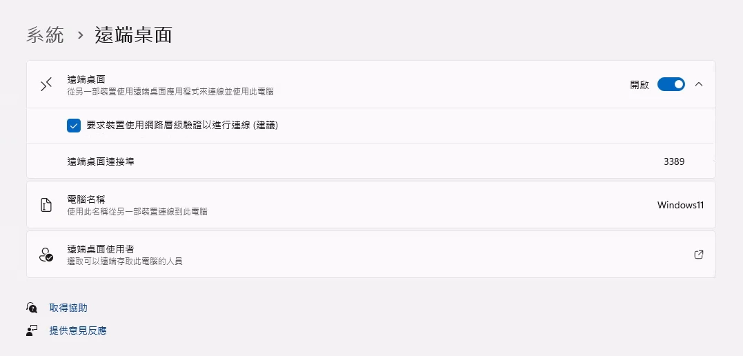 參照Microsoft說明,點選系統設定 → 系統,啟用遠端桌面。