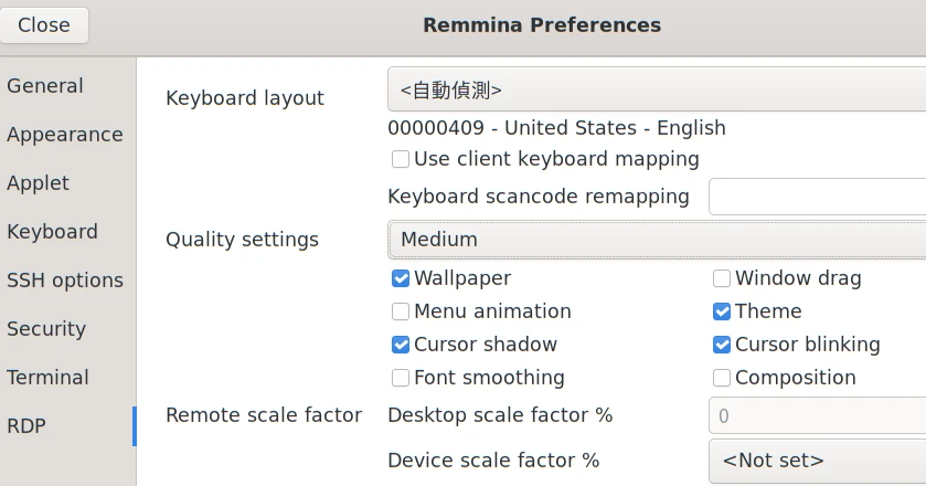 如果要顯示桌布,點選Remmina右上角的Preferences → RDP → Quality settings,將每個畫質的wallpaper都打勾,再重新連線。不過虛擬機若沒直通顯示卡,好像就解決不了黑桌布的樣子。