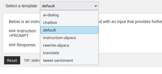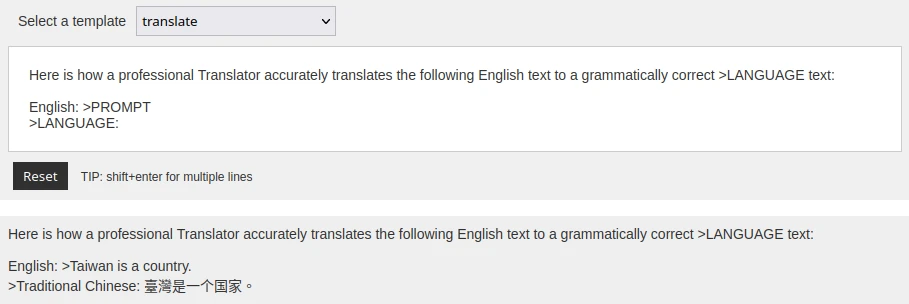 Dalai有內建一些範本,例如要AI扮演聊天機器人、翻譯的指示詞寫法。當然不給任何指示,直接開始對話也可以。