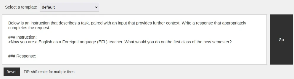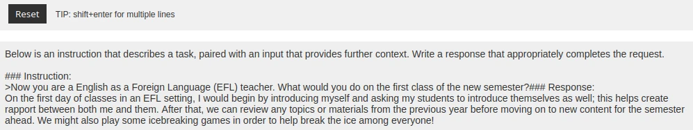 Default的格式即為在>符號後面填入問題。下面我問的是:「你作為英語老師,第一堂課你會做什麼?」