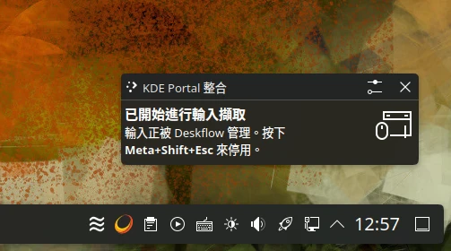 因為Wayland桌面對權限管制較嚴格,要透過Desktop Portal存取。Deskflow要抓取滑鼠動作的時候,GNOME和KDE Plasma桌面都會跳出警告。尤其KDE Plasma 6會一直跳出「輸出擷取」警告,覺得煩的可以點一下通知欄旁邊的選項把它關掉。