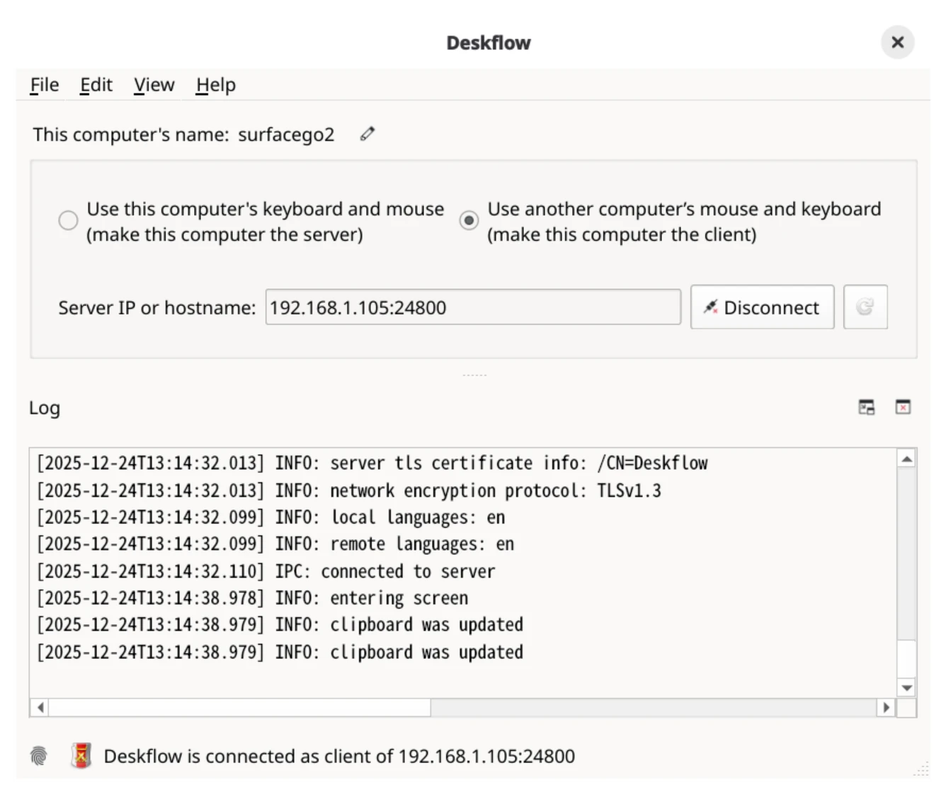 sudo ufw allow 24800然後在第二台電腦開啟Desktflow,將它設定為客戶端,輸入第一台電腦的區域IP或是hostname,點選連線。