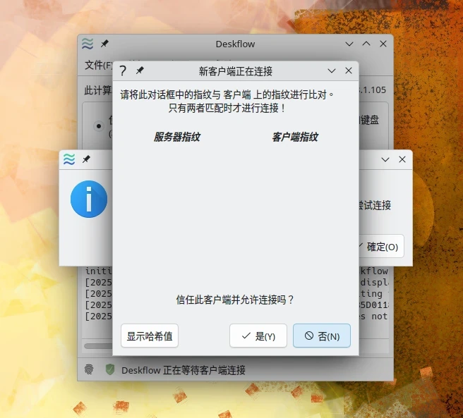 GNOME和KDE Plasma桌面應該都會在Deskflow連線階段時要求使用者確認,這時請點選同意。