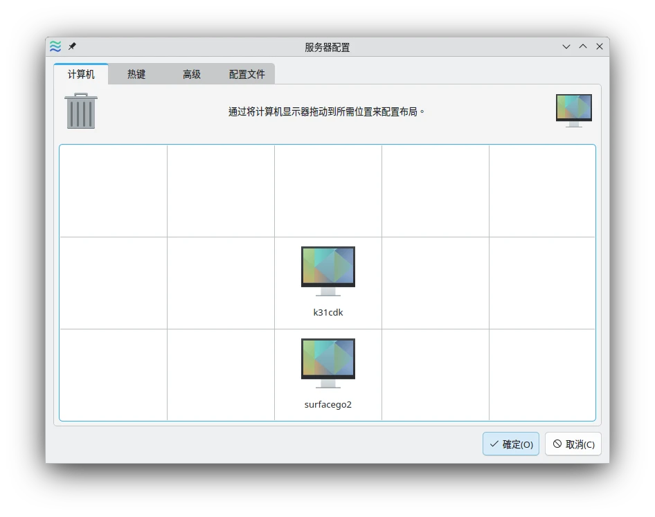 那麼就是把滑鼠往下滑到螢幕邊緣,滑鼠就會跑到第二部電腦囉。兩邊的鍵盤剪貼簿也會共用。啊不過你要傳檔案的話還是不行,得依靠KDE Connect或者自行設定SSHFS之類的檔案共享。