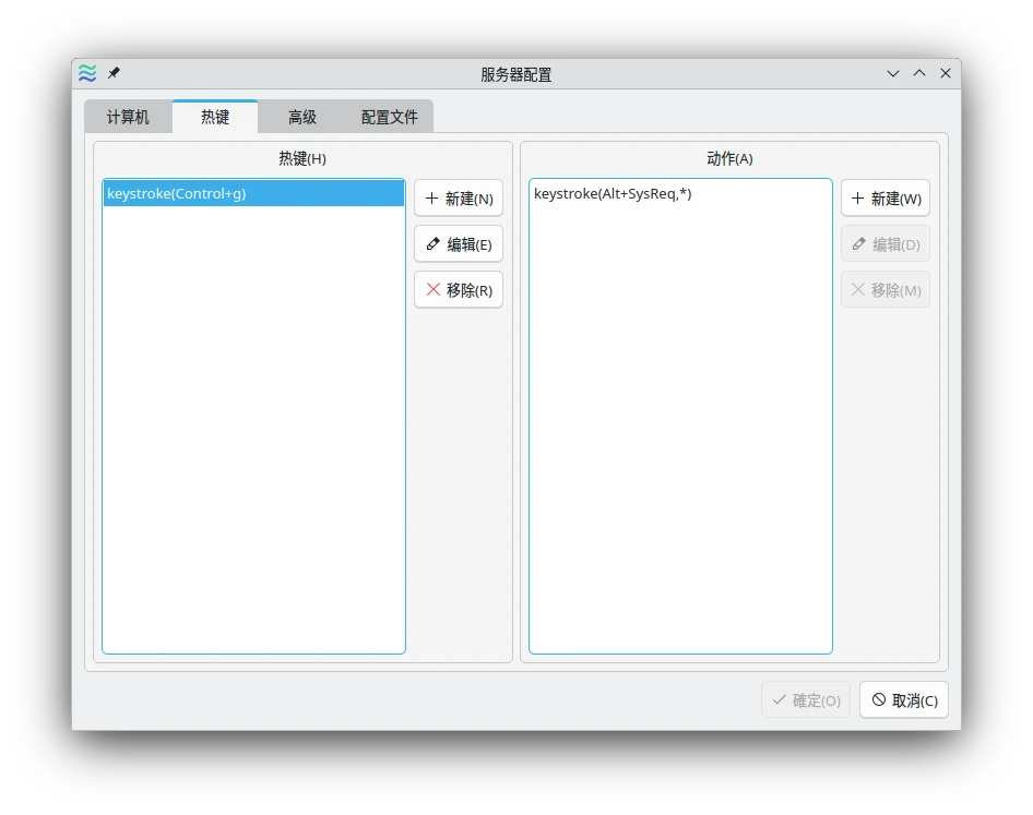 有些快捷鍵按下去的時候會被目前的系統攔截,導致Deskflow無法抓到。這個時候得手動編輯Dekskflow設定檔,Flatpak版位於~/.var/app/org.deskflow.deskflow/config/Deskflow/deskflow-server.conf,調整裡面實際觸發的快捷鍵。