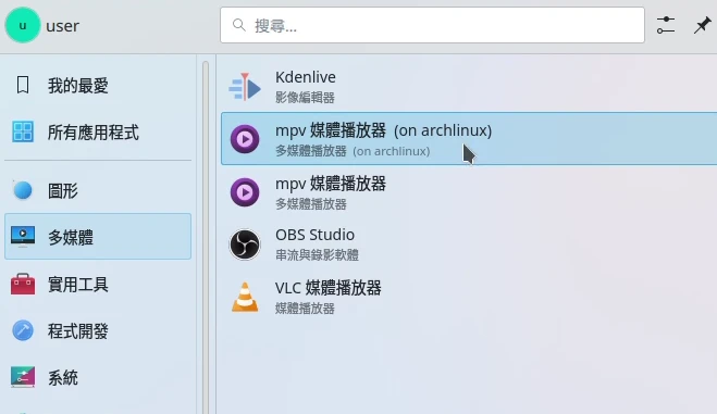 /home/user/.local/share/applications/archlinux-mpv.desktop可能要改成下述內容才能正常開啟