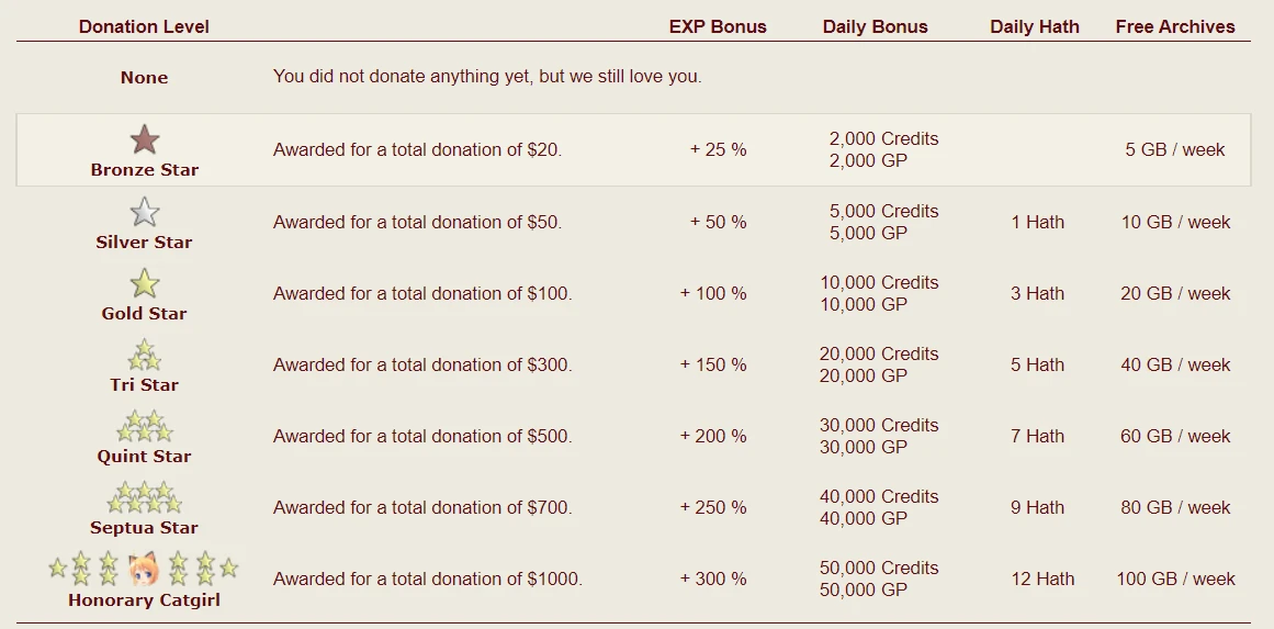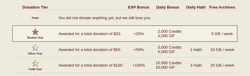 E-hentai的等級制度透過參與社區和捐款決定,最低捐等值20美金的加密貨幣就能升級到銅星。