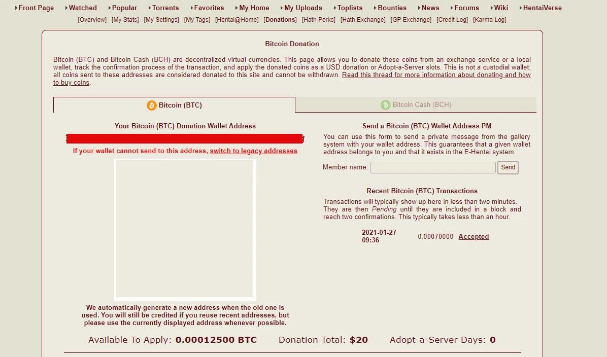 流程: 買比特幣 → 轉帳到E-hentai自己帳戶的比特幣錢包 → 捐款給站方