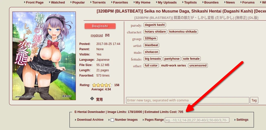 每個IP一天內有5000點流量限制(會員銅星10000點),下載一本20頁的本子約會花掉700點。以此換算下來每天可以下載7本原始畫質的本子。若需要大量下載,建議還是用Archive Download。