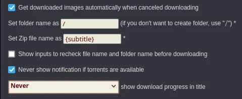 Set folder name as填入/,這樣下載後的壓縮檔就不會有任何子資料夾。並且在Set Zip file name as後面填入{subtitle},讓壓縮檔用畫廊的日文標題命名。接著取消勾選Never show notofications if torrents are available.