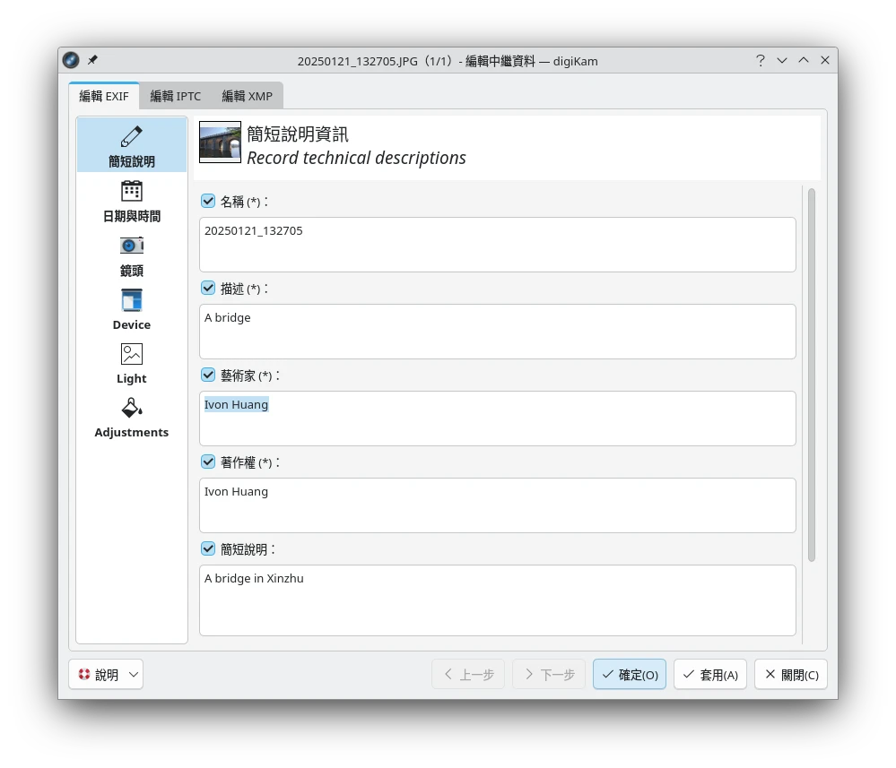選取照片,點選項目 → 編輯中繼資料。digiKam編輯EXIF欄位的時候似乎只能填入ASCII字元。