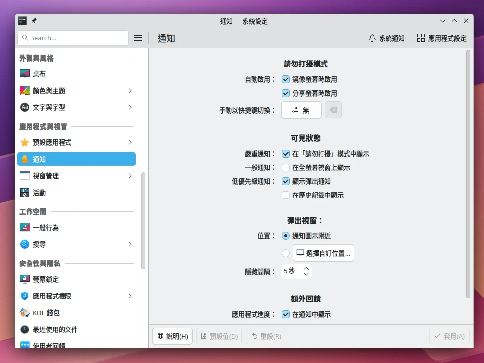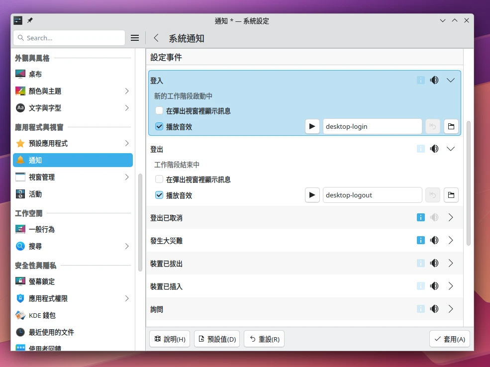 KDE Plasma 6以上版本,開啟系統設定 → 通知 → 系統通知。(KDE Plasma 5則是系統設定 → 通知 → 特定應用程式的設定 → Plasma工作空間 → 設定事件)