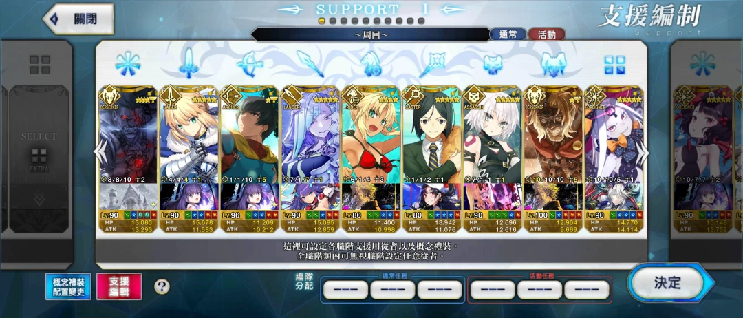 相較於課一堆,卻只有抽到寥寥幾隻打手,輔助只有一隻五星自選孔明+玉藻前的台版帳號,實在差太多了啦!我台版帳號日常刷種火的隊伍,只能組平民隊:Lv.90的阿拉什(Archer),Lv.100的斯巴達克斯,加上任意裝備50% NP充能禮裝的輸出手,這樣可以搭配任意輔助角,刷完日常種火關卡和部分活動關卡。可是在那之外的關卡,我是打得很痛苦的說。