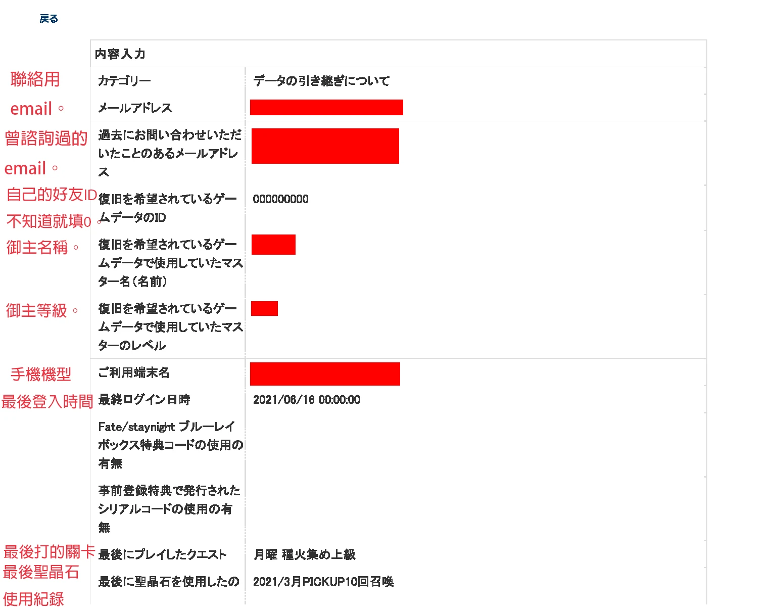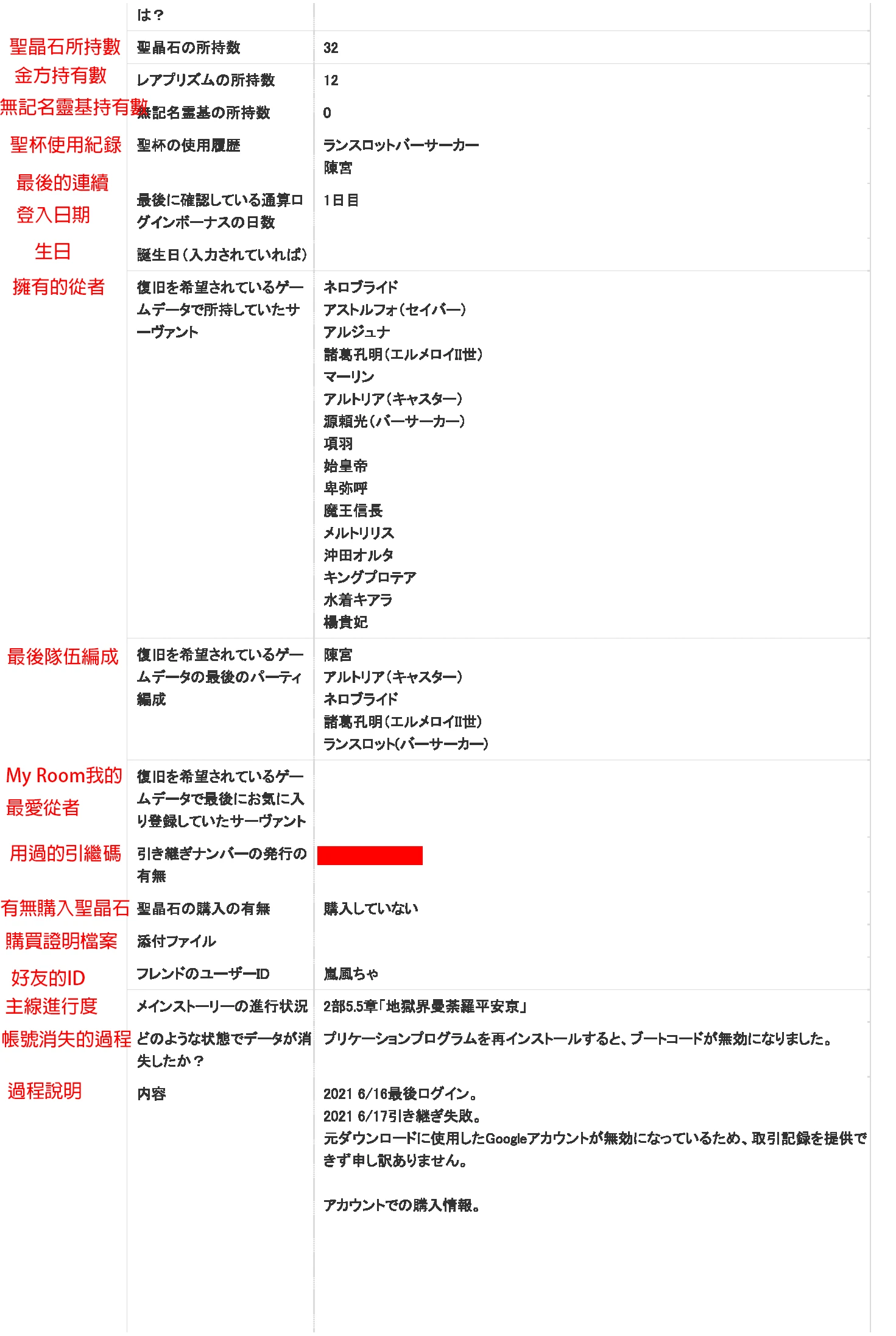 2021年6月17日,重刷Android系統前,忘記寫下引繼碼。FGO日版顯示「引繼失敗」,無法登入,只好去填表單請求客服找回帳號。