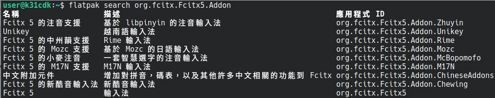 雖然我們要用Flatpak安裝Fcixt5,但宿主機端依然要安裝輸入法模組相關套件,作為容器與宿主機的「橋樑」才可以喚醒Fcitx5,否則就只能在Flatpak應用程式裡面使用而已,無法在宿主機的GTK與QT程式使用Fcitx5打字。