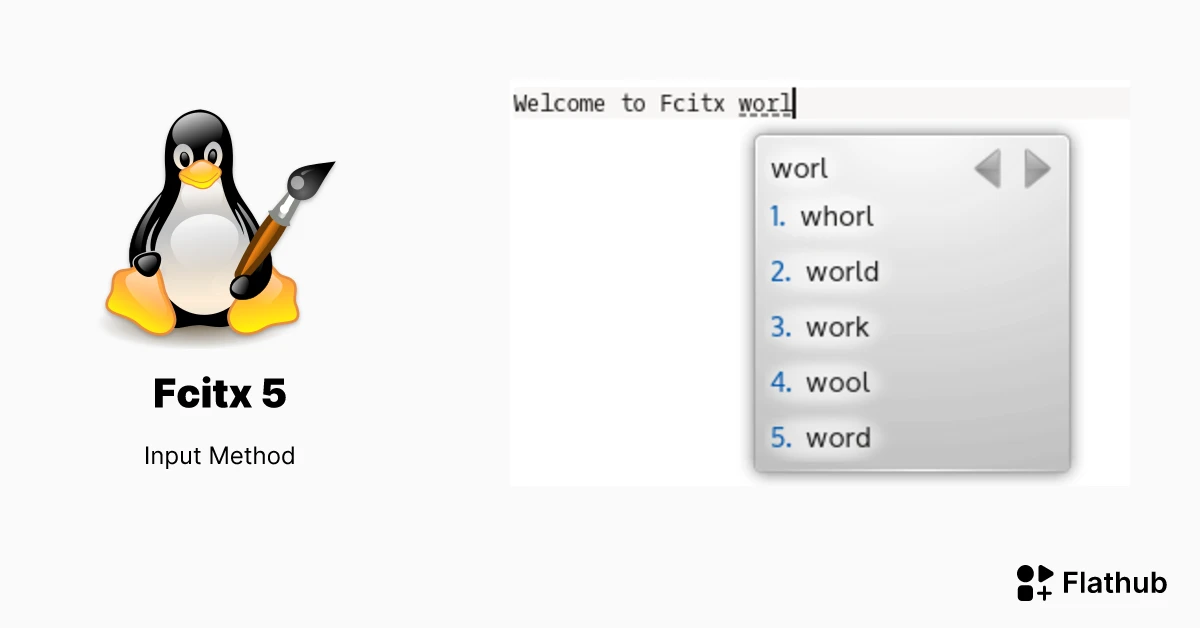 目前Fcitx5已在Flathub上架,任何Linux發行版透過Flatpak容器即可安裝,而不用使用系統的套件管理器(如APT/DNF/YUM/Pacman/Zypper/Portage)安裝。