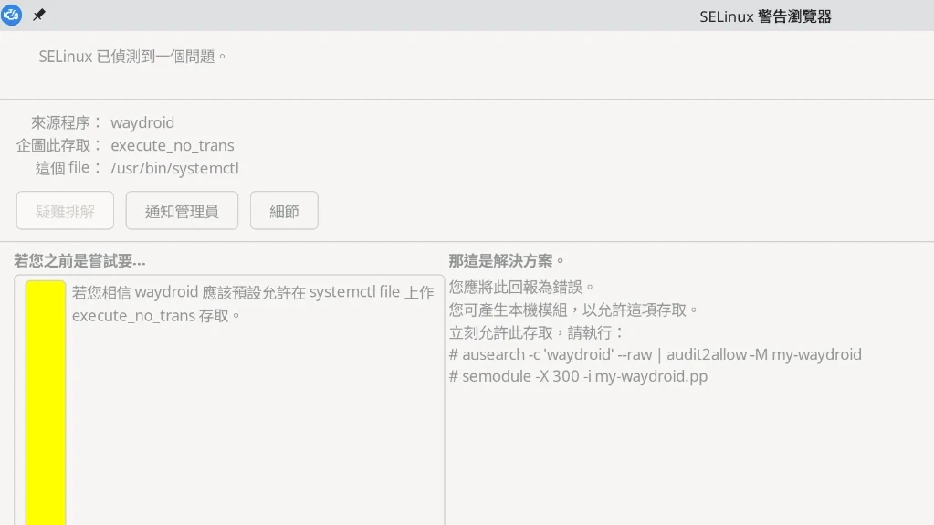 waydroid-selinux套件不過這些訊息不會自己消失。需要開啟sealert界面,依照畫面指示執行指令,新增SELinux模組。