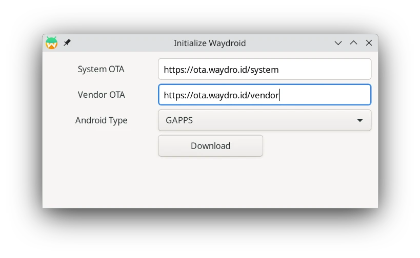 https://ota.waydro.id/system,第二個填入https://ota.waydro.id/vendor,映像檔版本選內建GAPPS的,接著開始下載。下載完成後Waydroid會自己開啟。