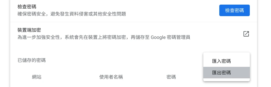 之後會得到一個CSV檔案。此檔案裡面的密碼是明文保存的,匯入完成務必刪除。