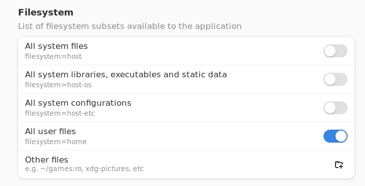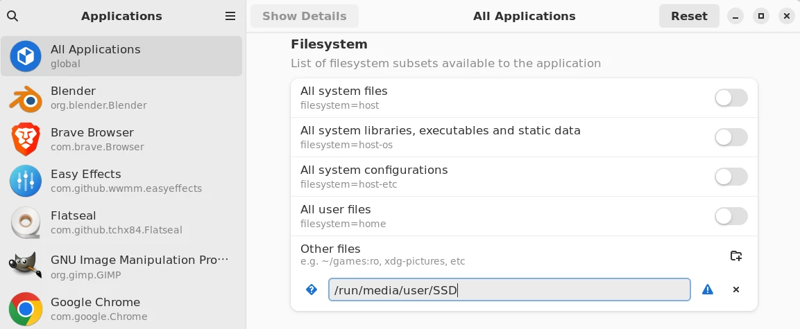 開放應用程式讀取特定目錄:比方說我有一個額外掛載的硬碟,用lsblk指令查看後,掛載點確認是/run/media/user/SSD,那麼就將路徑加進去Other Files。路徑後面還可以加上:ro或:rw規定該目錄是否為唯讀狀態。