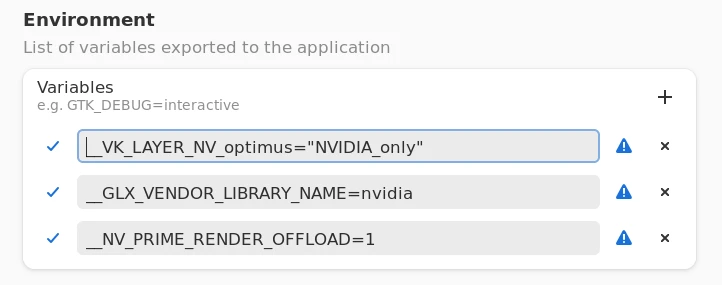 又如,需要暫時使用Nvidia獨立顯示卡跑3D加速,那麼就在Environment欄位設定Nvidia PRIME的環境變數: