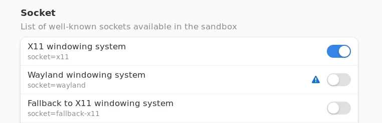 如果你想強迫特定程式以X11模式執行,就把Wayland的權限關掉,並開啟Fallback to X11,這樣在Wayland工作階段該程式就會變成XWayland模式執行。