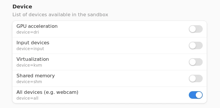 flatpak override這個指令可以開關網路、目錄、匯流排、硬體裝置、X11伺服器等等的存取權限,也可以用來設定環境變數。如果您想知道每個權限的詳細用途,請看Flatpak文件的說明。