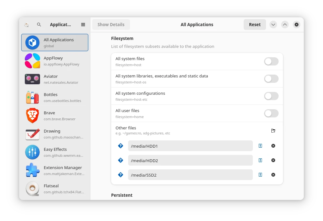 Flatseal最上面的「All Applications」是全域設定,所有的應用程式會全域套用規則。