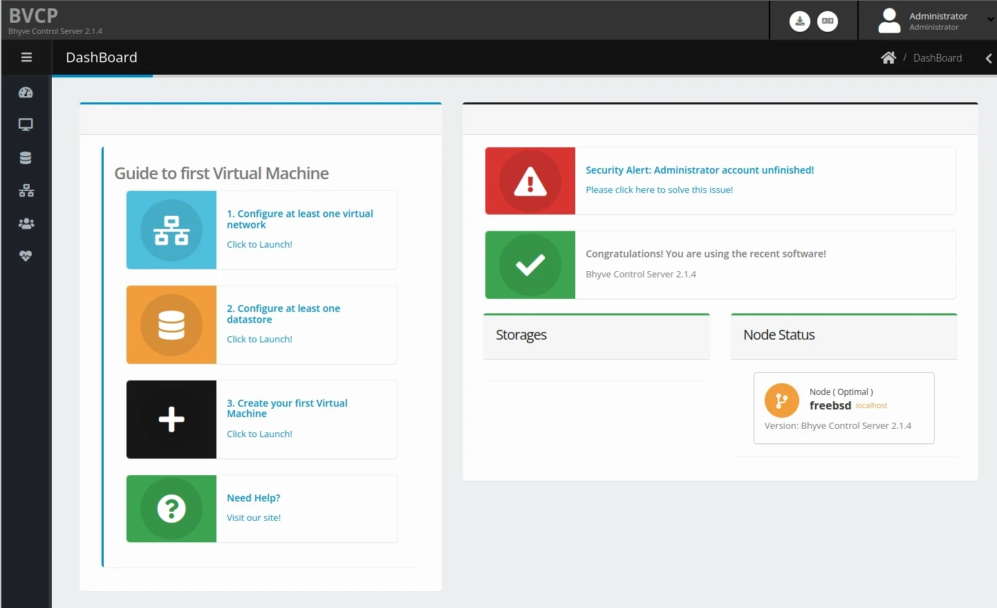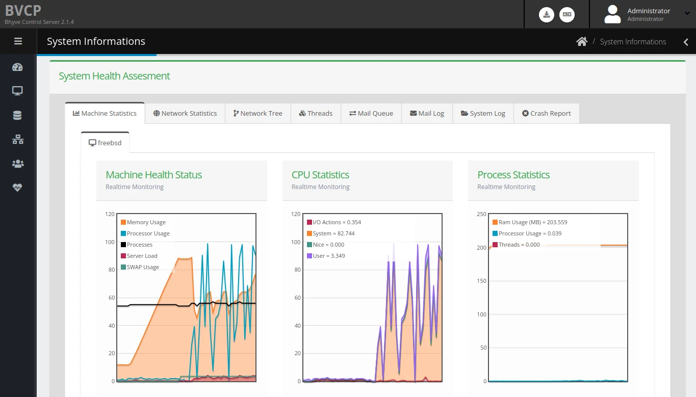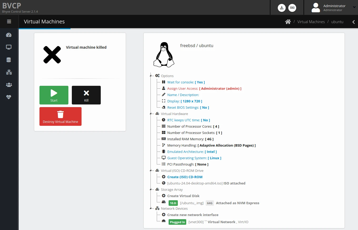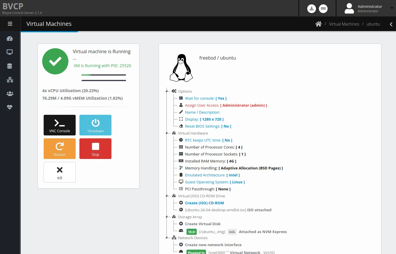 bhyve本身需要打指令不太好用,所以得裝個管理器。純文字介面管理工具有vm-bhyve;圖形介面則可以用CBSD或者商業軟體BVCP介面管理,BVCP的網頁界面功能還蠻周全的。