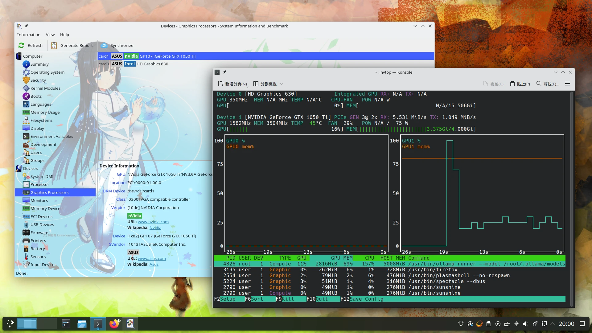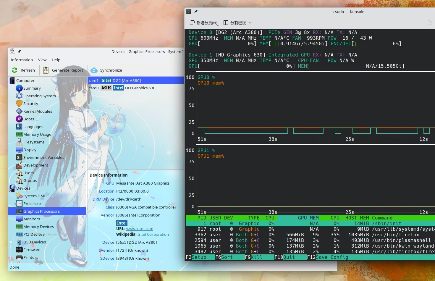 雖然換用Intel顯卡,用開源Mesa驅動,完全解決了過去Nvidia閉源驅動導致的Linux Wayland桌面破圖問題,可是我基本上放棄了跑本地AI的想法。我想說就順順用來看影片打遊戲就好了吧…但是都拿來玩柚子社的遊戲,GPU使用率都沒超過50%。這張Intel Arc A380也就AV1硬體編碼加速有優勢,問題是我又沒有常常剪影片!