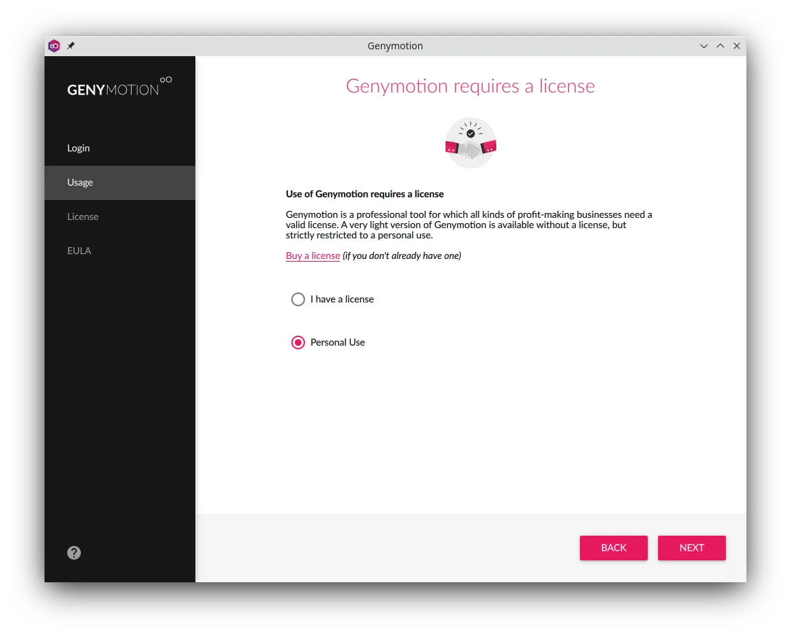 Genymotion屬於混合開源授權的閉源軟體,一般用戶使用需要註冊帳號,且功能受限,需要花錢訂閱授權方能解鎖全部功能。