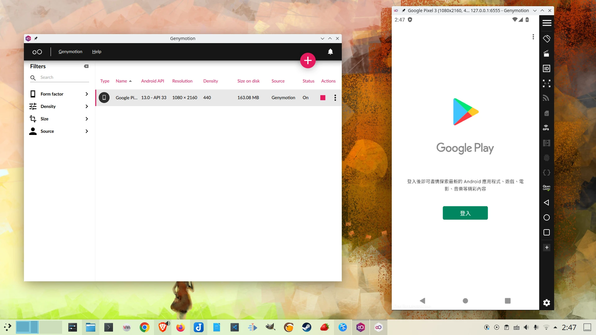 你可以直接從Linux的檔案管理器,拖動APK到Genymotion的視窗安裝。安裝時建議以x86_64或Universal的APK為主,沒有的話再裝ARM版,這麼做的原因是Genymotion內建的ARM轉譯器不見得能正常執行ARM架構的APP。