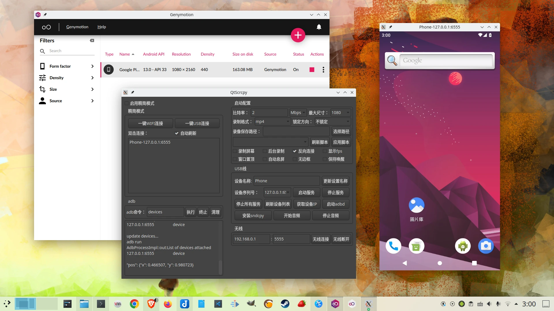 - 弄好ADB偵錯後,你可以跑個QTScrcpy,繞過Genymotion的浮水印限制。用你的魔法對付回去!