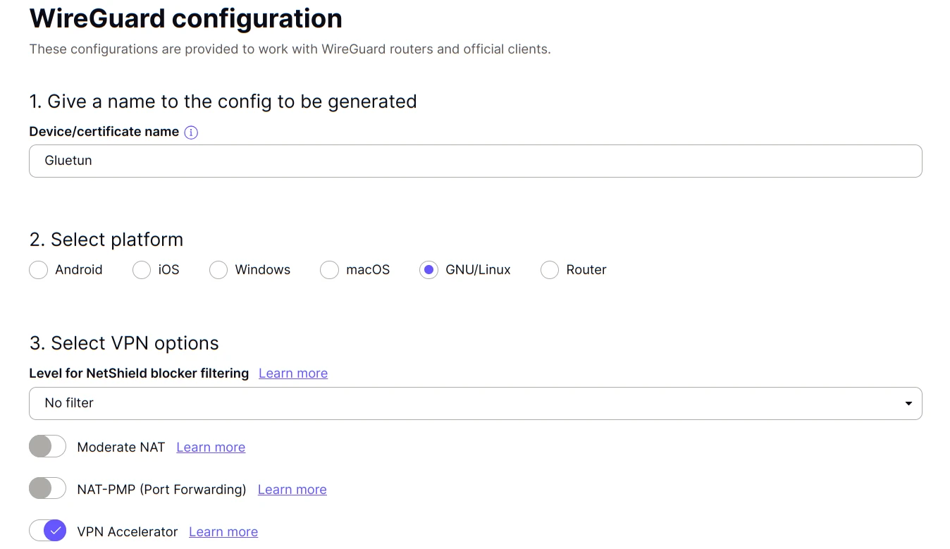 請參閱ProtonVPN官方文件,進入Downloads頁面,下滑到WireGuard,填寫服務名稱