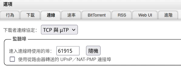 在qBittorrent偏好設定 → 連線開啟通訊埠,填入ProtonVPN所轉發的通訊埠,並關閉UPnP功能。