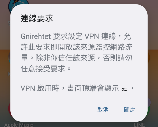 等待Gnirehtet把APK傳到手機完成安裝後,手機就會跳出VPN連線的通知