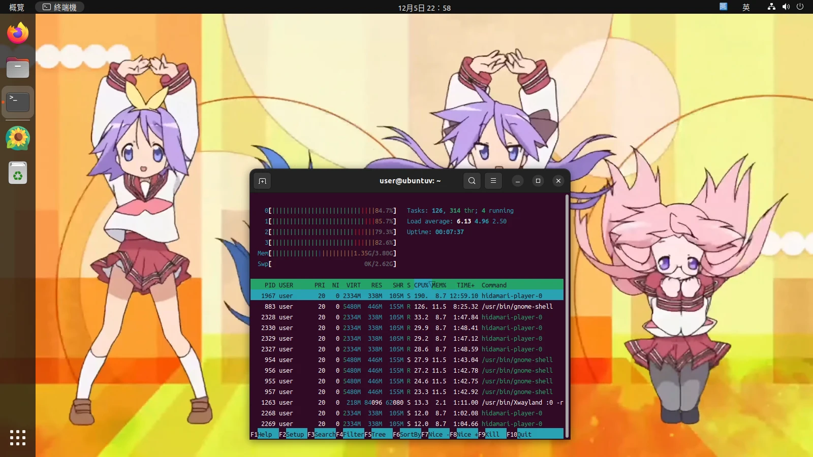 htop的資料顯示,播放1080p60的影片會佔用一部份CPU資源。如果電腦跑不動請降低影片畫質。