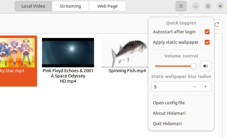 另外,如果你想要GPU硬體加速,可考慮改用Hidamari的後繼者Hanabi,只不過Hanabi得依賴GNOME桌面才能運作。