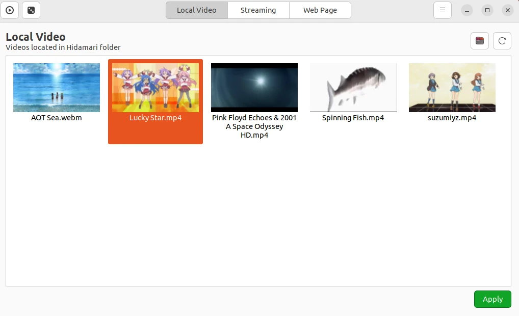 ~/影片/Hidamari目錄。開啟Hidamari主程式,應該就會出現影片讓你選。左上角有一個