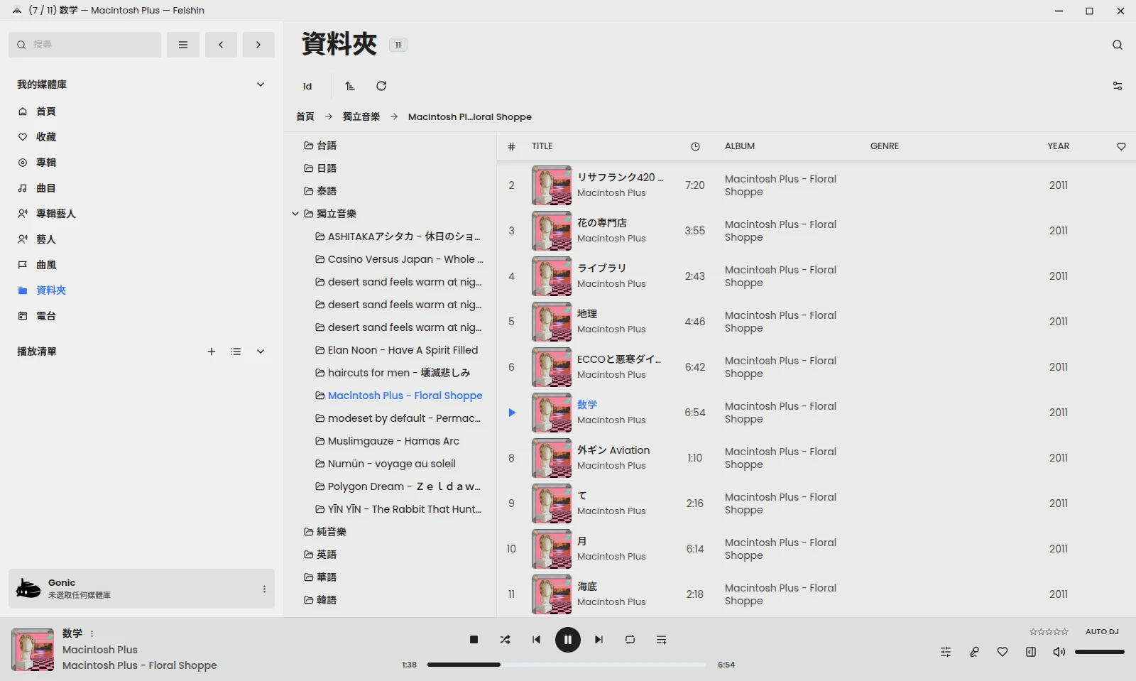 電腦端的話有Feishin。安裝後在OpenSubsonic的欄位輸入Gonic伺服器網址就可以用資料夾模式播放音樂了!
