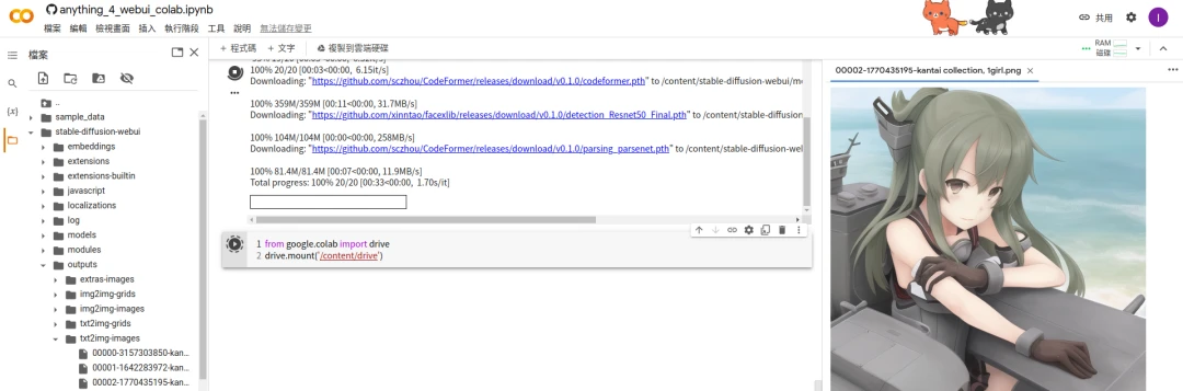 或者你也可以選擇drive分支的筆記本,它會將程式和模型放在你的雲端硬碟,這樣就可以保存上次進度,下次開啟也會比較快。但是以儲存空間作為代價,至少需要10GB空間用來放程式和模型。