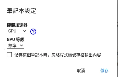 點選上方的選單→執行階段→變更執行階段類型,確認目前執行階段是使用GPU計算。