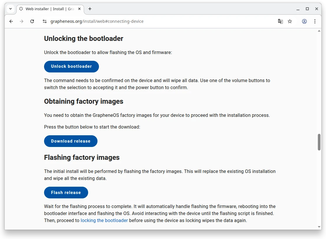 GrapheneOS官網說明文件提供二種刷機方法,一種是用圖形界面Web Installer,一種是用指令稿。