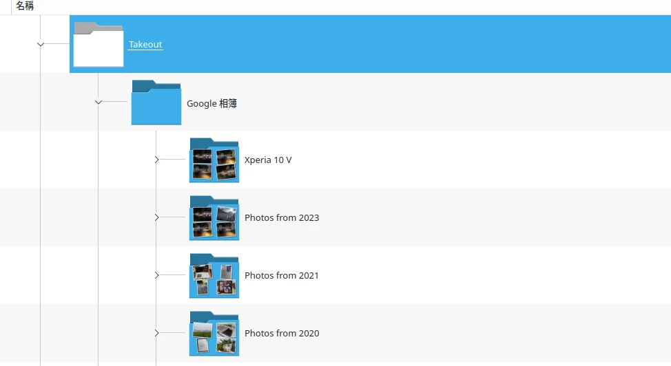 使用7zip解壓縮。Google相簿的壓縮檔解壓縮後會含有大量json檔;並且照片是按照年份資料夾分類的,這樣不好用其他軟體管理。